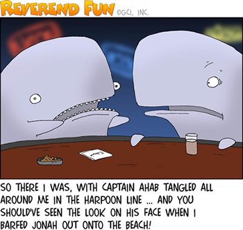 Herman Melville was not very famous and liked in his time, but after World War I, he began to be read again. His story of Moby Dick has long sections of it where he just talks about whaling and shipping. Thankfully, the movie version leaves that out. The rule - a sperm whale named Moby Dick is bound to raise a flurry of jokes. So, the rule of class is, a joke can only be made once. If you want to keep making up jokes, you need to be original. Characters in Moby Dick