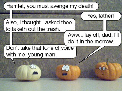 Dramatis PersonaeHamlet, Prince of Denmark - The protagonist. Hamlet is not happy about his uncle's marriage to his mom especially so close to his father's death. Be question - is he crazy or just acting that way? King Hamlet - Dead at the beginning of the play, but appears as a ghost and demands vengence upon his murder. Big question - can you trust him? King Claudius - King Hamlet's brother. He marries his brother's wife soon after Hamlet's death. Queen Gertrude - Hamlet's mom. She marries her brother-in-law (Claudius) shortly after her husband's death. Polonius - The Lord Chamberlain. He is an advisor to the king and father of Ophelia and Laertes. He is very controlling. He does not trust Ophelia with Hamlet and does not trust Laertes off at France. Laertes - Polonius's son and Ophelia's brother. He cares a lot for Ophelia (in a protective big brother way). He does not think that Hamlet really loves his sister and tells her to stay away from him. he blames Hamlet for bad things that happen in the play. Ophelia - She is Polonius's daughter and sister to Laertes. She loves Hamlet and does not understand Hamlet's actions since he does not confide to her. Reynaldo - Laertes friend who was sent by Polonius to France in order to spy on Laertes. Horatio - Hamlet's true friend. He is the one who brings Hamlet to see his father's ghost. Rosencrantz - Hamlet's friend who is sent to spy on him. Always seen with Guildenstern. Could be seen as "Dumb." Guildenstern - Hamlet's friend who is sent to spy on him. Always seen with Rosencrantz. Could be seen as "Dumber." Marcellus - A guard on watch duty who sees the ghost. Bernardo - A guard on watch duty who sees the ghost Francisco - A guard on watch duty that does not see the ghost. Gravedigger - Uh...he digs graves. Yorick - The famous skull that Hamlet talks to belonged to Yorick. Alas, poor Yorick, I knew him well... Sexton - Just a title for a servant. Nothing dirty... Fortinbras - He lives in Norway. His father (also called Fortinbras) was killed by King Hamlet. Just like Prince Hamlet, Fortinbras did not become king, his uncle did instead. Fortinbras wants his father's lands, which were seized by King Hamlet, to be returned and has raised an army. Near the beginning of the play, everyone is getting ready for a possible invasion by Fortinbras army. The king of Norway, however, promises that he will only allow Fortinbras to attack Poland. Fortinbras is a mirror of Hamlet in many ways. The Players - A traveling group of actors that helps Hamlet test Claudius. They produce a play called The Mousetrap. The Churlish Priest - He refuses any burials for suicides. Voltimand - Sent by Claudius to Norway to prevent war. Cornelius - A royal kiss up. Osric - A foppish and foolish royal kiss up. A gentleman - A royal kiss up so unimportant, he doesn't even get a name.
