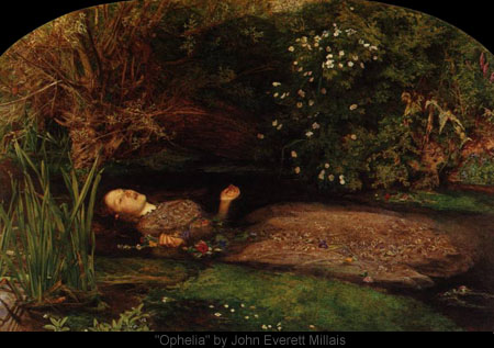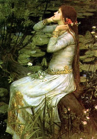 OpheliaElizabeth Siddal posed for this picture by John Everett Millais in the early 1850s. He was one of the Pre-Ralphaelite Brotherhood, a group of painters that tried to reformt he art standards during the Romantic/Victorian period. While she was in the tub of water, one of the lamps that was being used to keep the water warm blew out. Millais, who was so intent on his painting, failed to notice this. Siddal did not complain. As a result, she got very sick and never completely recovered. She had health problems for the rest of her life. Millias paid her doctor bills, but only after Elizabeth's father threatened him with legal action. It took Millais four months to paint the background. It was not an easy process, but since the Pre-Ralphaelites were determined to be "true to nature," he endured it all the same. The flowers in this picture are symbol. The willow