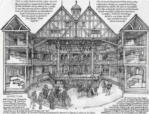 The following comes from Wikipedia. You can click the link and read the full article: Layout of the Globe At the base of the stage, there was an area called the 'yard' where people (the "groundlings") would stand to watch the performance. Around the yard were three levels of seating, which were more expensive than standing: the first two were called the Twopenny Rooms and the top level was called the Penny Gallery. A rectangular stage platform thrust out into the middle of the open-air yard. This stage measured roughly 40 feet wide and 30 feet deep. On this stage, there was a trap door for use by performers to enter from beneath the stage; the area beneath the stage was known as the 'cellarage'. There was a second trap door in the back of the stage that was used for the same purpose. Often the area beneath the stage is also called 'hell,' since supernatural beings such as the ghost in Hamlet enter and exit the stage from this area. On two sides of the stage were large columns supporting a roof over a portion of the stage. This ceiling was called the 'heavens', and was probably painted with images of the sky. A trapdoor in the heavens enabled performers to 'fly' or descend using some form of rope and harness. The back wall of the stage consisted of three doors on the first floor and a balcony on the second. The doors entered into the 'tiring house' (backstage area) where the actors dressed and awaited their entrances. The balcony housed the musicians and could also be used for scenes requiring an upper space, such as the balcony scene in Romeo and Juliet. In addition, it could be used as the 'Lord's Room', where higher-paying audience members could pay to be seated -- more to be seen than to see the play, since they would have been behind the performers. The first Globe burned to the ground in 1613, apparently by flaming material expelled from a cannon used for special effects during a performance of Henry VIII that ignited the thatched roof of the gallery. It was rebuilt immediately, this time with a tiled roof, and reopened in July of the following year. Like all the other theatres in London, the Globe was closed down by the Puritans in 1642. It was destroyed in 1644 to make room for tenements. Its exact location remained unknown until remnants of its foundations were discovered in 1989 beneath Anchor Terrace on Southwark Bridge Road. There may be further remains beneath Anchor Terrace, but the eighteenth century terrace is listed and may not be disturbed by archaeologists. |