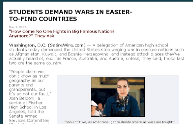 The Colbert Report's tweet: Of course, Stephen Colbert couldn't sit this out. Here's his tweet back: So here is the burning question: Is it O.K. to be racist if you are pointing out the problems with racism? Colbert is not the only one to run into this problem. Mark Twain (Huckleberry Finn) and Harper Lee (To Kill a Mockingbird) have both had their books banned for racist content when they both are trying to point out problems with racism. Extra Credit Opportunity: where is the line for racism? Worth 1 test grade. SatireWire:"Students Demand Wars in Easier-to-Find-Countries"
