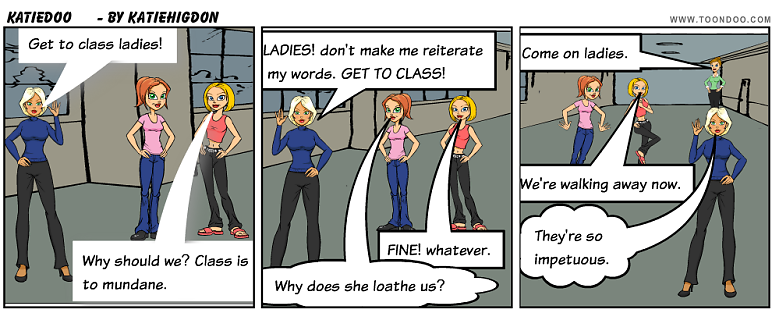 have a comic panel for it. Definition at the top, sentence at the bottom.