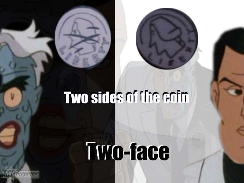 Two-Face- Appeared in Batman comics, Two-Face's character was born of when a District Attorney is splashed in acid by gang leader during a trial. At the burning of his face, Harvey's alter-ego came to surface. From this multiple personality disorder, Harvey abandoned the life of law, and lived the life as a criminal. However, his two sides are always disputing about what to do with a victim and such; in order for Two-Face to pick a decision, he relies on a flip of a coin in order to prevent the dispute between his two personalities. |