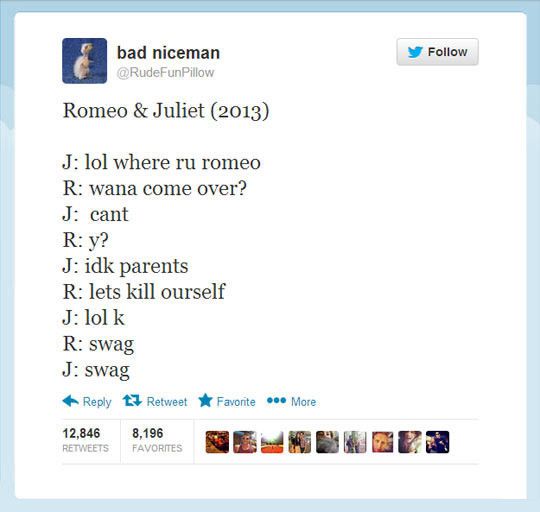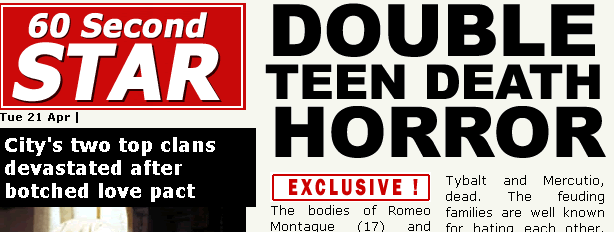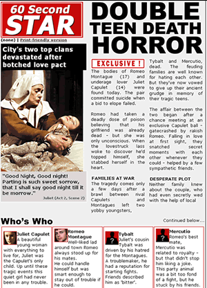 Romeo and Juliet in Space? Save the universe by collecting parts of quotes from Romeo and Juliet. http://www.canadianshakespeares.ca/Speare_full_free_Folder/speare.html